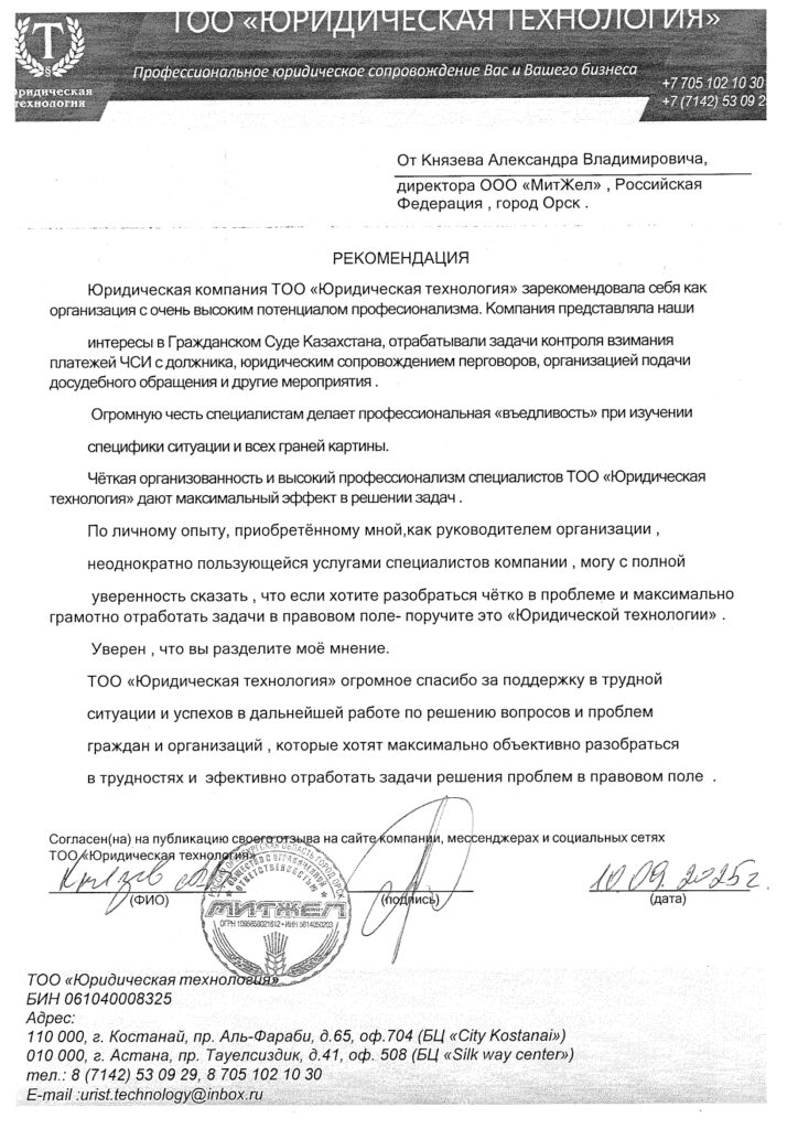 От всего сердца благодарю юридическую компанию «Юридические Технологии» (г. Костанай) и лично адвоката Татьяну Сергеевну!⚖️
